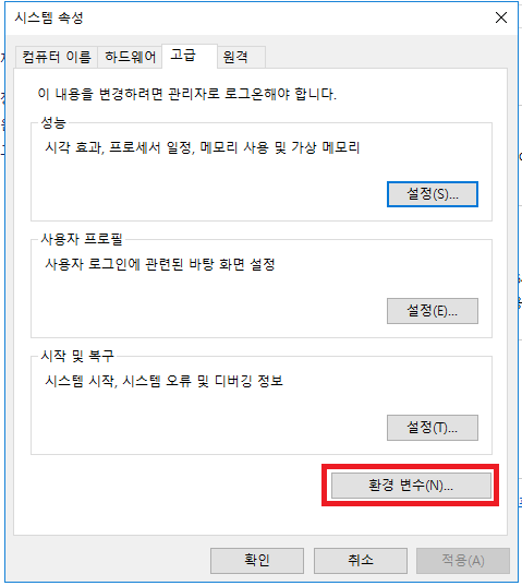 환경변수 버튼을 눌러 환경변수에 접근한다.