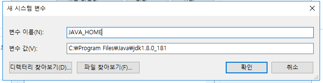 JAVA의 Home 디렉터리를 설정한다. 이때 직접 입력하는것도 좋지만 혹시나 경로가 잘못되었을 수도 있으니 디렉터리 찾아보기 버튼을 눌러 JDK가 설치된 디렉터리를 찾는것을 권장한다.