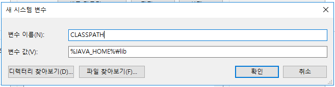 CLASSPATH는 java실행을 위한 라이브러리의 위치를 지정한다. 이는 위 JAVA HOME위치 하위의 lib를 지정해주면 된다.